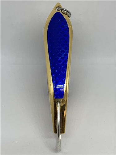 Our #100 Gator Kingspoon® Gold with Blue tape is made of high quality stainless steel. The spoon is 3 1/2″ long and has a 3407SS 5/0 hook and a heavy duty stainless steel split ring. The weight is .45 oz.