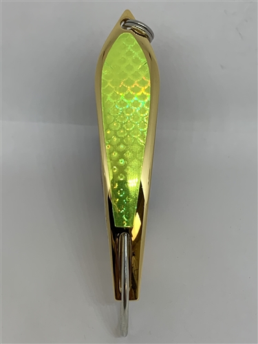 Our #100 Gator Kingspoon® Gold with Chartreuse tape is made of high quality stainless steel. The spoon is 3 1/2″ long and has a 3407SS 5/0 hook and a heavy duty stainless steel split ring. The weight is .45 oz.