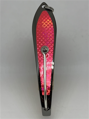 Our #200 Gator Kingspoon® Black Nickel with Pink tape is made of high quality stainless steel. The spoon is 4 11/16″ long and has a saltwater 7/0 hook and a heavy duty stainless steel split ring. The weight is .9 oz.