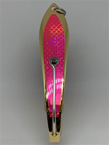 Our #200 Gator Kingspoon® Gold with Pink tape is made of high quality stainless steel. The spoon is 4 11/16″ long and has a saltwater 7/0 hook and a heavy duty stainless steel split ring. The weight is .9 oz.