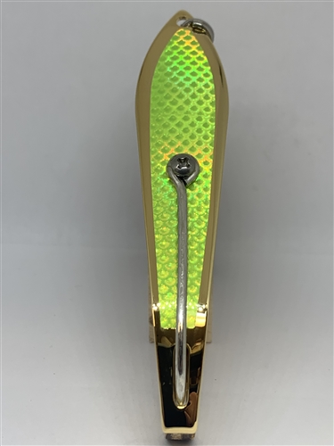 Our #250 Gator Kingspoon® Gold with Chartreuse Tape is made of high quality stainless steel. The spoon is 4 11/16″ long and has a saltwater 7/0 hook and a heavy duty stainless steel split ring. The weight is 1.1 oz.