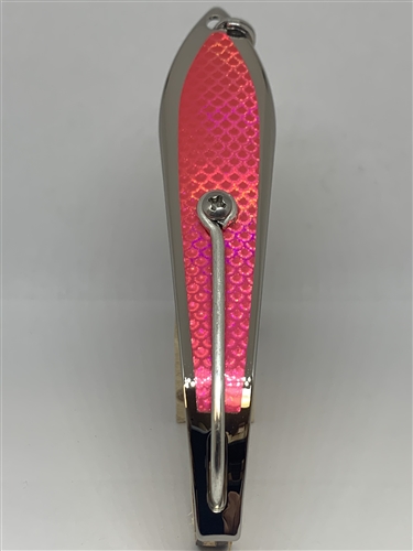 Our #250 Gator Kingspoon® Silver with Pink tape is made of high quality stainless steel. The spoon is 4 11/16″ long and has a saltwater 7/0 hook and a heavy duty stainless steel split ring. The weight is 1.1 oz.